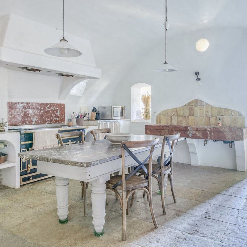 The vaulted kitchen with high-end La Cornue range cooker connects with the sunny breakfast room.