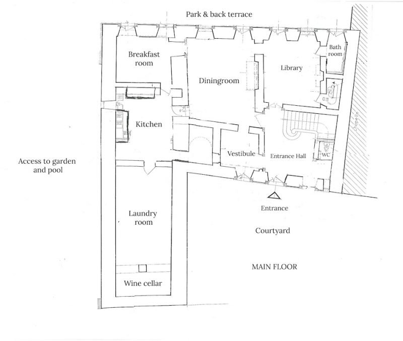 On the ground floor, you will find the entrance hall overlooking the majestic staircase with its high ceiling decorated with plasterwork and an 18th century floor.