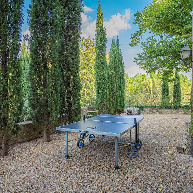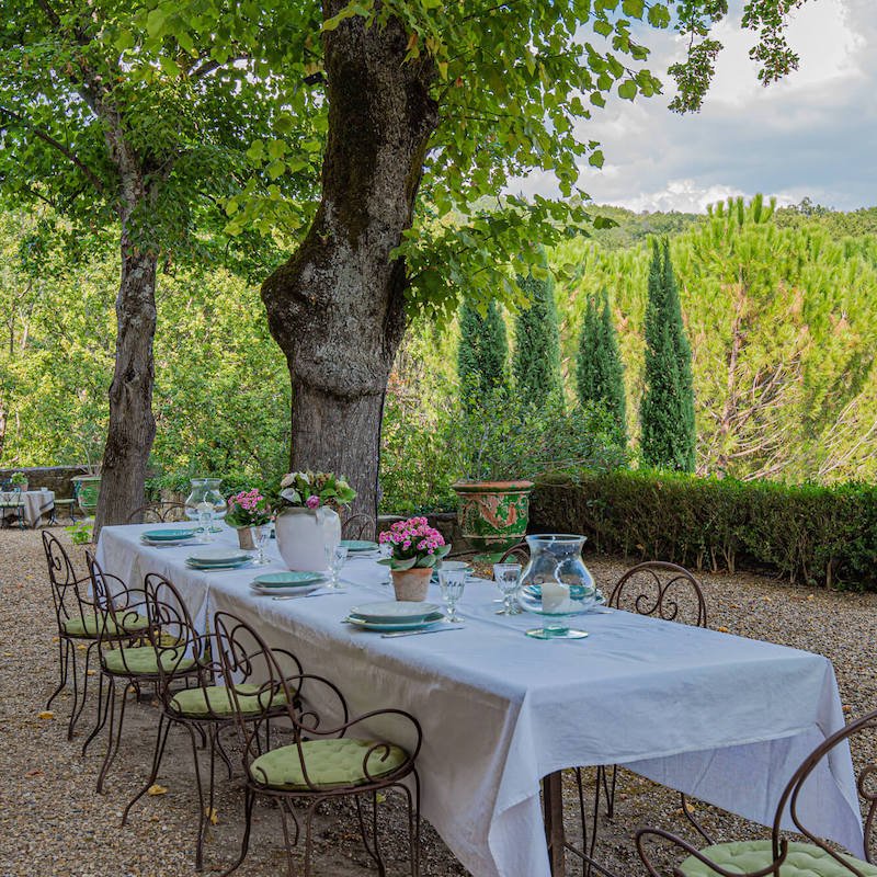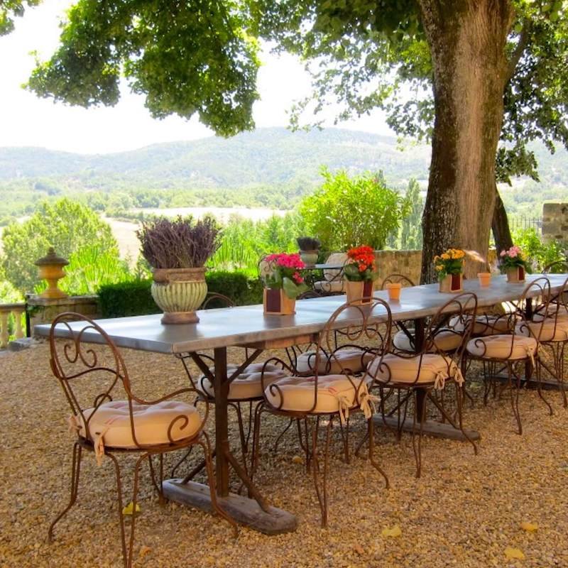 This large terrace space is ideal for meals throughout the day, shaded beneath the impressive trees, and comfortable seating for all.
