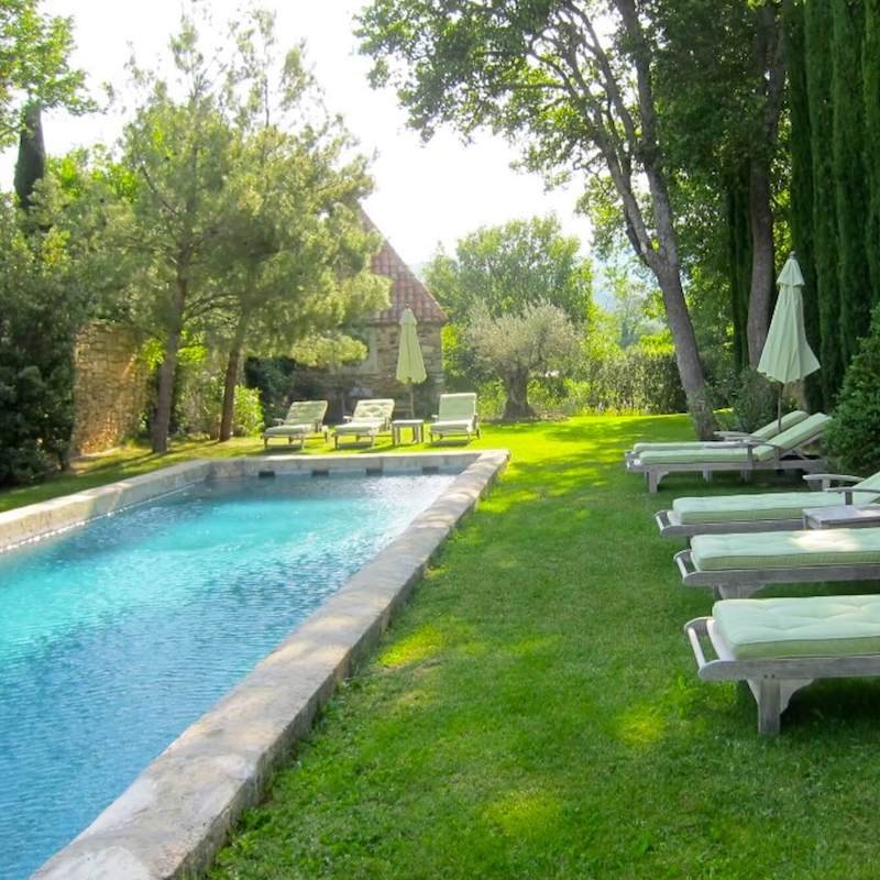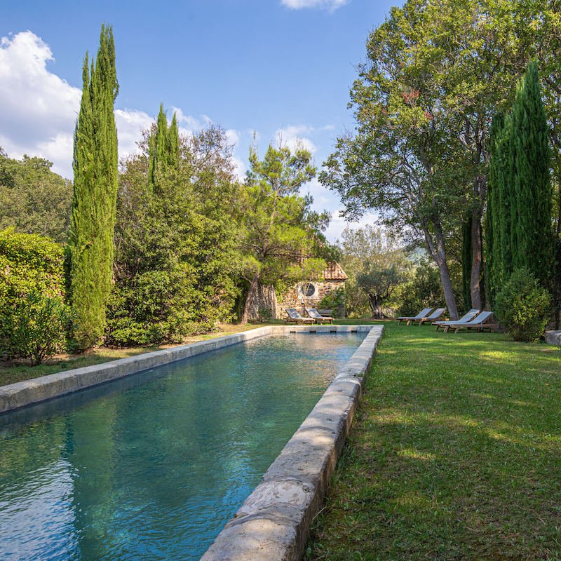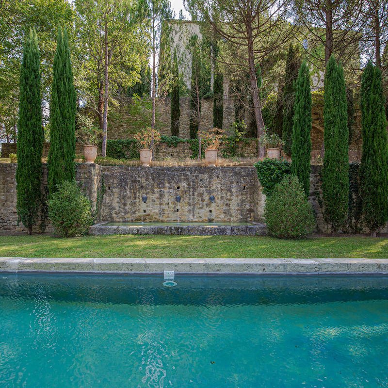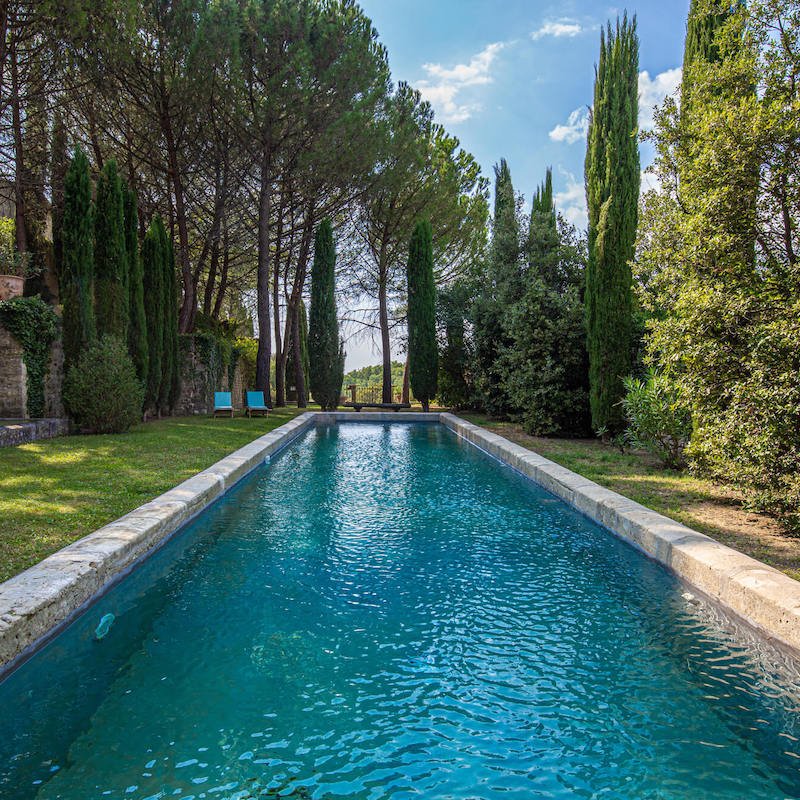 The chateau property include a stunning, modern swimming pool, nestled in the lush greenery of the lower terrace.