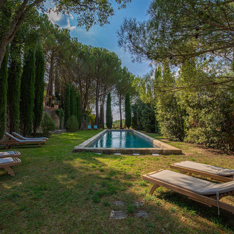 Chateau de Gignac is located in southern France on a private, multi-level, forested park of approximately 3,000 m² (nearly an acre). To explore the park, take the historic, grand staircase down from the main terrace. The terrace, modern pool, and walking paths of the park offer great opportunities to take in the natural splendour of the surrounding countryside, relax, and enjoy a variety of recreational activities.
